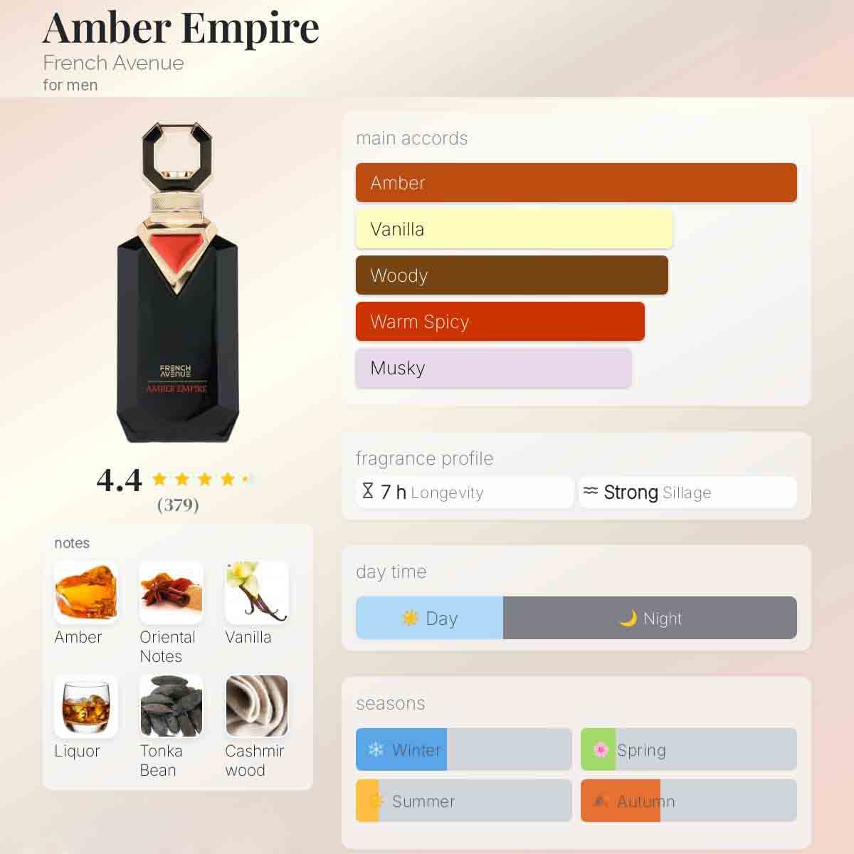 Amber Empire by French Avenue is a Oriental Woody fragrance for men. This is a new fragrance. Amber Empire was launched in 2025. A powerful, modern oriental-woody scent, embodying modern luxury with rich amber, sweet vanilla, and deep woods.