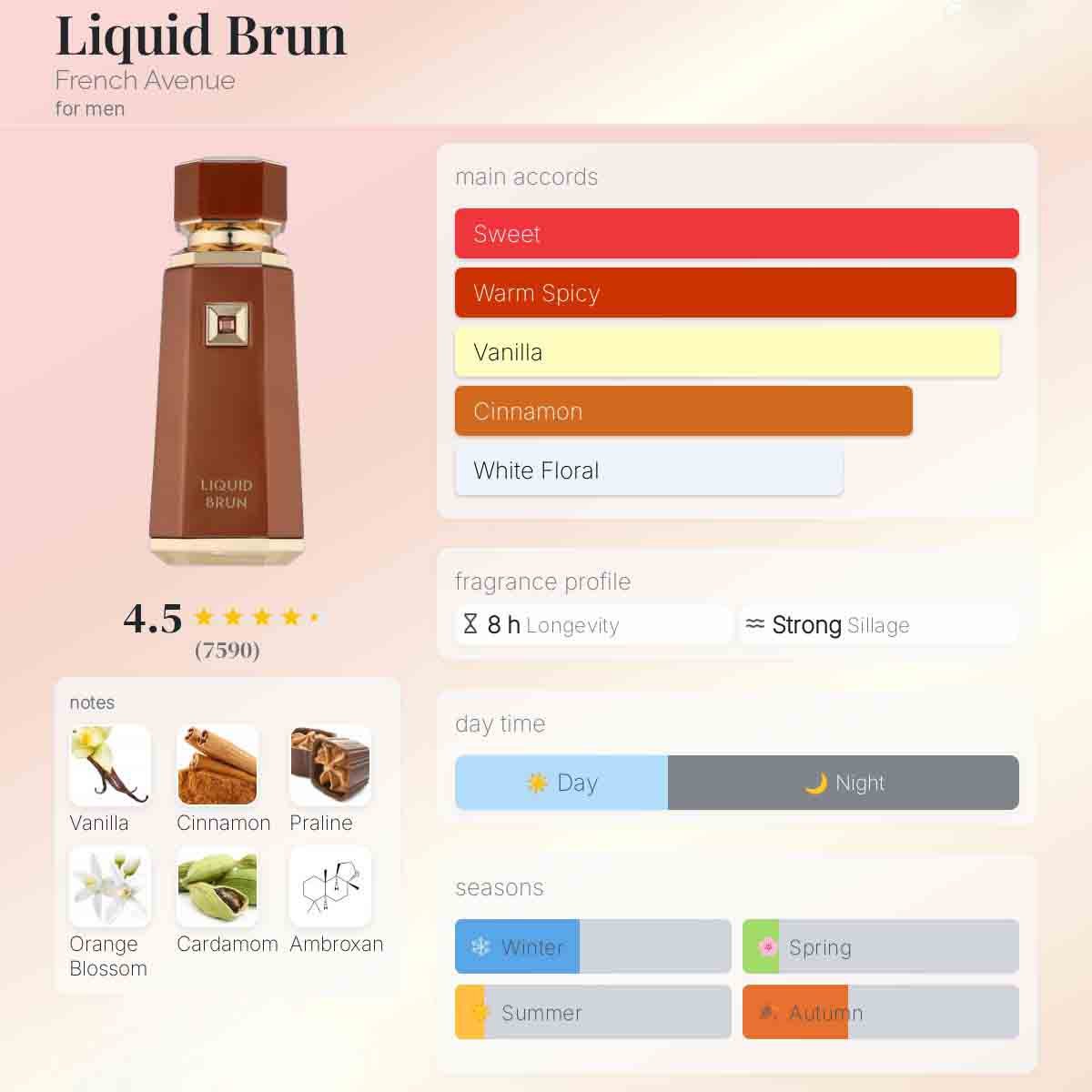 Liquid Brun by French Avenue is a warm, spicy, amber-vanilla men’s fragrance launched in 2024, It starts fresh and spicy, develops into creamy vanilla, and finishes with a deep, sweet, woody base.