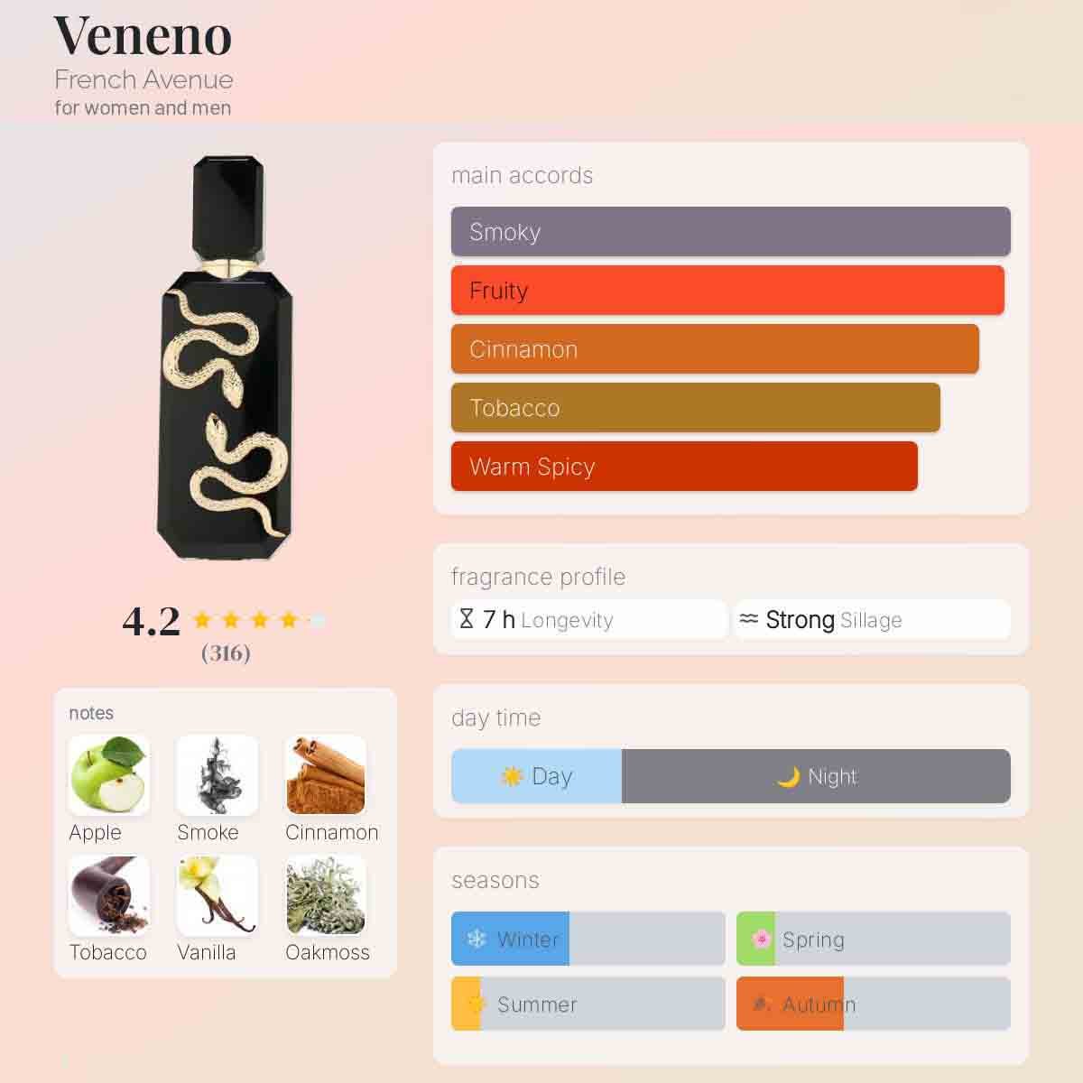 Veneno by French Avenue is a Aromatic Fruity fragrance for women and men. This is a new fragrance. Veneno was launched in 2025. The nose behind this fragrance is Jean-Louis Sieuzac.