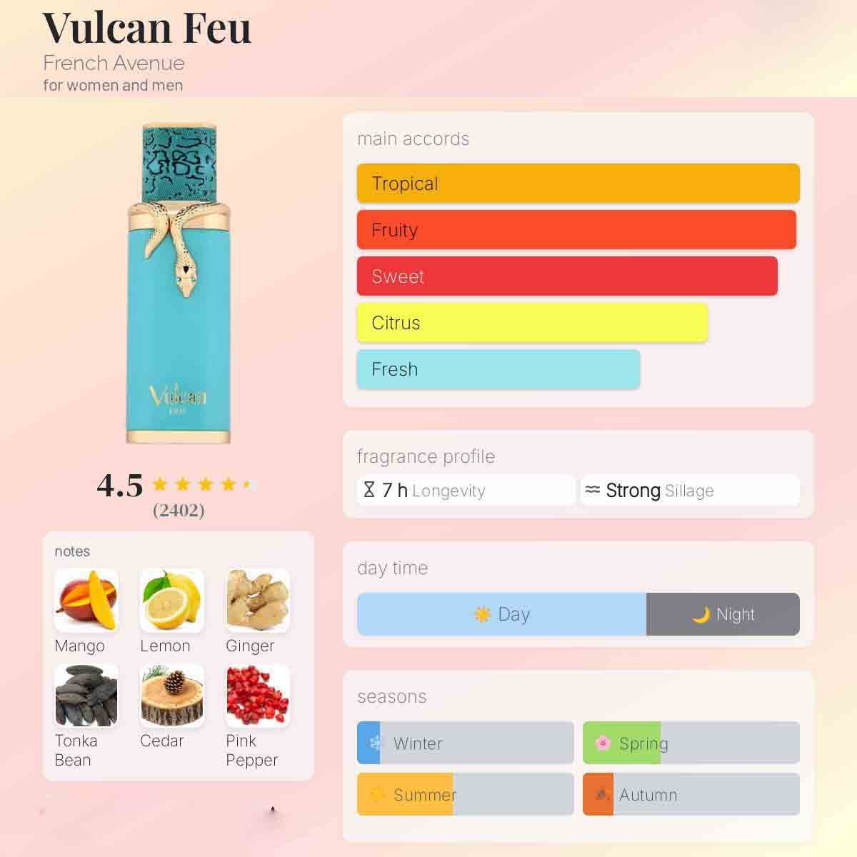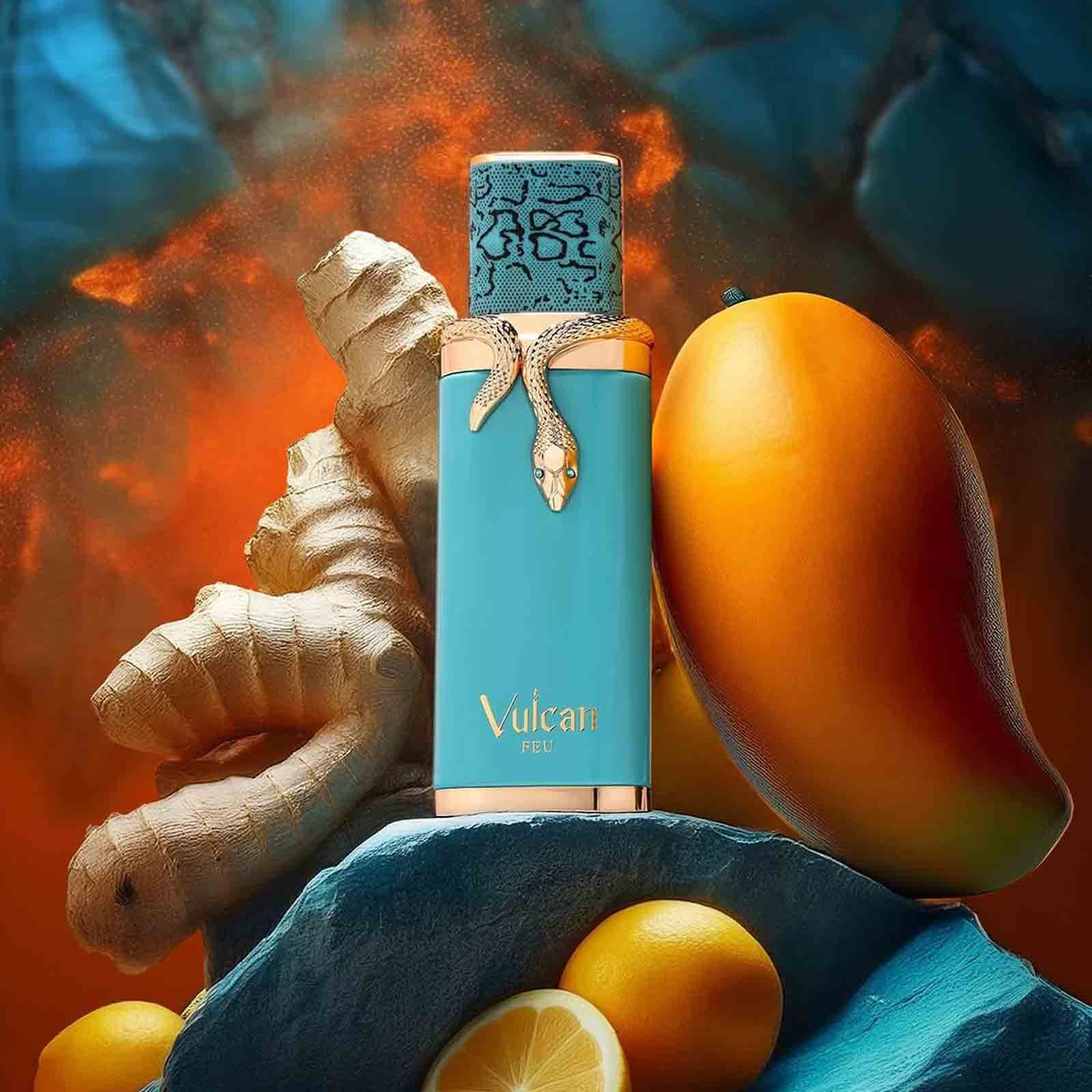Vulcan Feu by French Avenue is a popular unisex oriental-woody fragrance known for its vibrant, tropical opening of mango, ginger, and citrus, evolving into a floral heart with jasmine and pink pepper, and settling into a warm, woody base of cedarwood, tonka bean, ambergris, and musk, offering a bold yet sophisticated scent often compared to Stéphane Humbert Lucas God of Fire. It’s described as a fruity-spicy, long-lasting perfume suitable for those seeking a confident, modern, and charismatic signature scent.