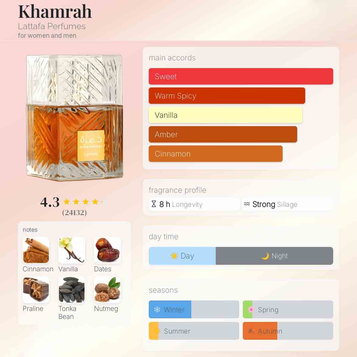 Khamrah by Lattafa Perfumes is a Oriental Spicy fragrance for women and men. Khamrah was launched in 2022,Khamrah is a popular unisex, aromatic spicy fragrance known for its warm, sweet, and woody profile, often described as reminiscent of Angel’s Share but with its own distinct character